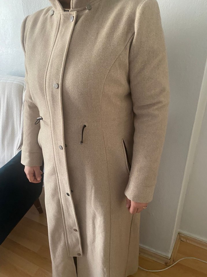 Düğmeli, bej renkli kaban, notlu yakalı ve uzun kolludur. Rahat kesimi ve yumuşak, sıcak kumaşıyla günlük kullanıma uygundur.
