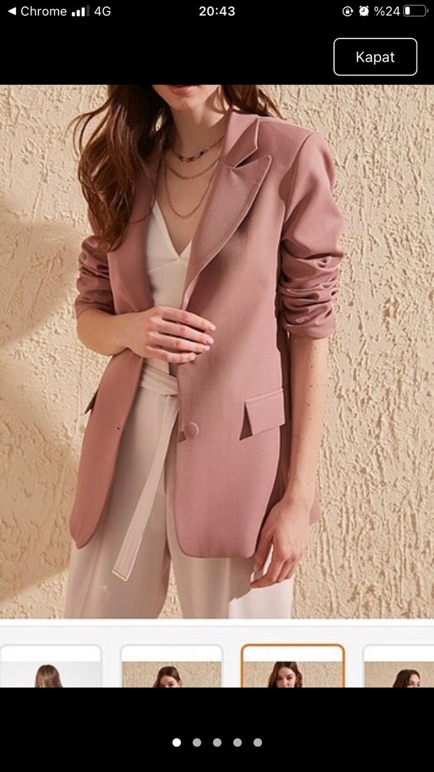 Düğmeli önü, uzun kollu ve normal kesimli bej blazer ceket, midi boyda ve yumuşak sentetik kumaştan üretilmiştir. Ofis için uygundur.