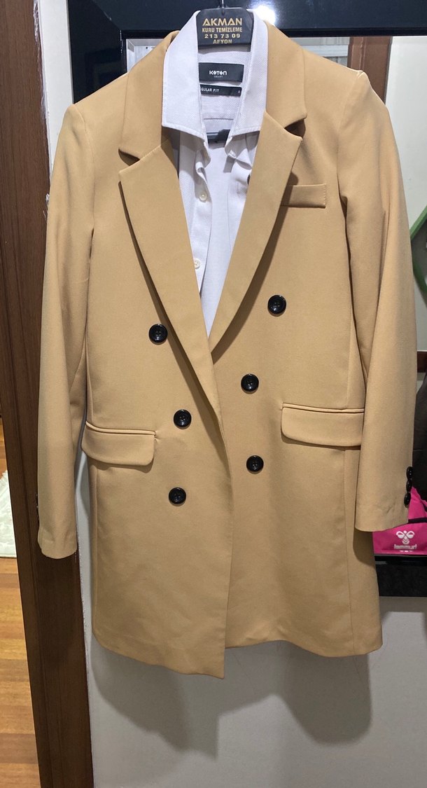 Düğmeli, uzun kollu ve çıt detaylı bej midi blazer. Sentetik kumaştan, normal kesim, ofis ve gündelik kullanıma uygun.