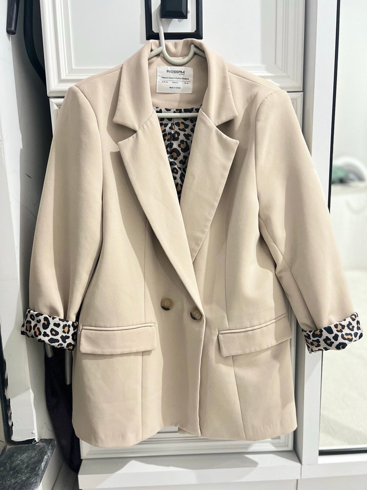 Düğmeli, bej midi uzunlukta kadın blazer ceket. Uzun kollu, regular fit ve leopar desenli astarlı, ofis kullanımı için uygundur.