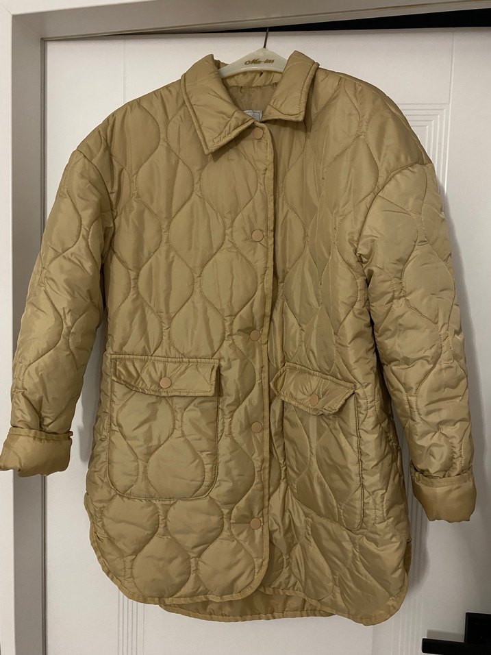 Düğmeli ön kısmı ve uzun kollu bej midi ceket, parlak kapitone kumaştan, bol kesimdir. Çentik yaka ve iki cep bulunur, günlük kullanıma uygundur.