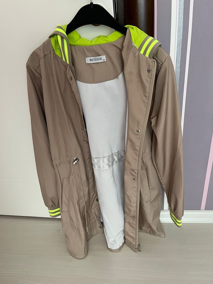 Bej renkte, düğmeli ve uzun kollu midi kadın ceket. Sentetik kumaştan, bol kesim ve yakasında kesik detay bulunur. Kapüşon ve manşetlerde gri-neon sarı çizgiler mevcuttur. 38-40 beden uyumlu