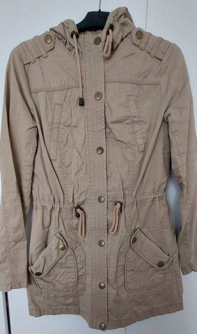 Bej renkli, düğmeli, normal uzunlukta kadın ceket. Keten kumaştan, kesimi vücuda oturan, yaka kısmı çentikli ve askılı kollu. Günlük rahat sokak stili için uygundur. Düğmelerinde biraz renk atması vardır.
