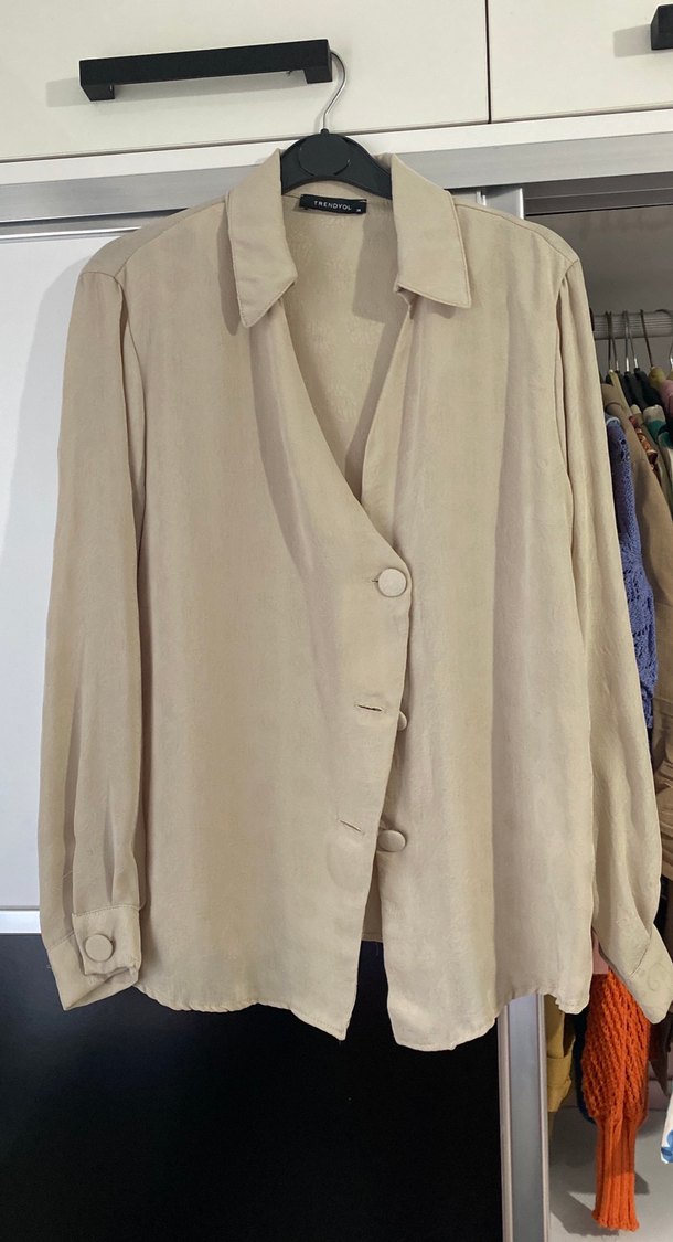 Bej renkli, düğmeli, uzun kollu kadın gömleği. Notch yaka ve midi boy, rahat keten kumaştan. Ofis ve sokak stiline uygun, salaş kesim.