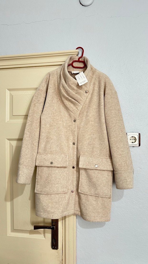 Düğmeli, uzun kollu, bol kesim bej midi kaban. Yumuşak ve sıcak kumaştan, cepleri büyük, günlük kullanıma uygun.