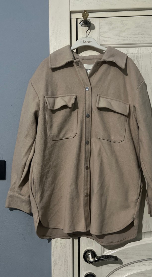 Düğmeli, bej renkte, notalı yaka ve uzun kollu kadın kabanı. Rahat kesim, midi boy ve iki ön cepli, yumuşak ve sıcak kumaştan üretilmiştir. Minimalist tarzda günlük sokak giyimine uygundur.