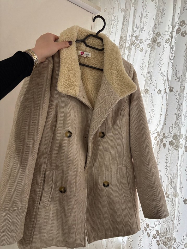 Düğmeli, bej midi uzunlukta, yün kumaşlı kadın kaban. Fitted kesim, uzun kollu ve notched lapel yaka detaylıdır. Rahat günlük kullanım için uygundur. Baya sıcak tutuyor.