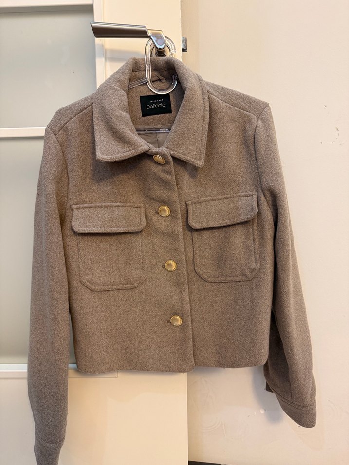 Düğmeli, bej renkli yün kaban, notalı yaka ve uzun kolludur. Normal kesim ve midi boyda, günlük rahat sokak stili için uygundur.