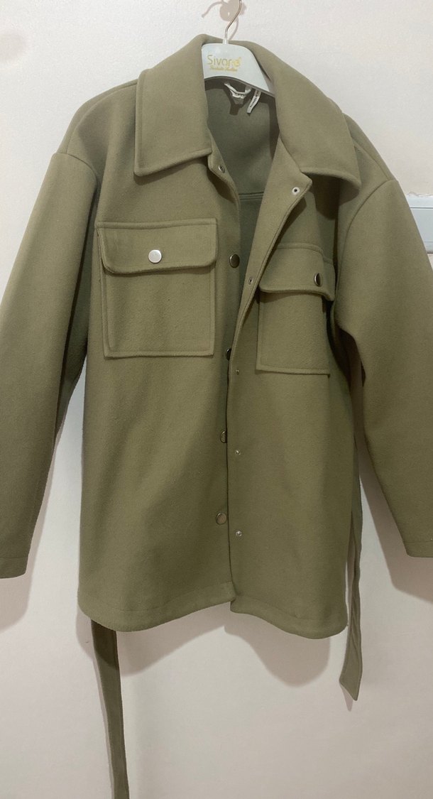 Düğmeli, bej renkli kadın kaban; notched lapel yaka, uzun kollu ve midi boydadır. Günlük kullanıma uygun sade tasarıma ve yumuşak, sıcak bir kumaşa sahiptir.