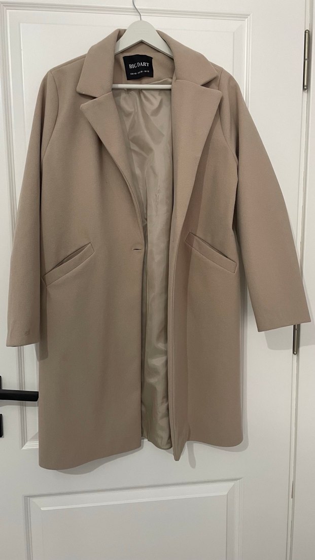 Bej renkli, diz boyu kadın kabanı. Düğmeli, geniş yaka ve uzun kolludur. Düz, ofis stiline uygun, sentetik kumaştan üretilmiştir. 1 kez kullanılmıştır 38/40 bedendir.