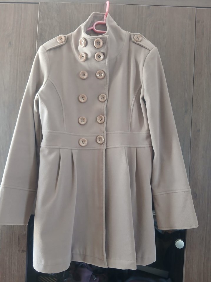 Düğmeli ön kısmı ve kesik yaka detayı olan bej midi kadın kaban. Uzun kollu, rahat kesim ve yumuşak, sıcak kumaştan üretilmiştir. Günlük kullanıma uygundur. Sorunu yok Çok az giyildi