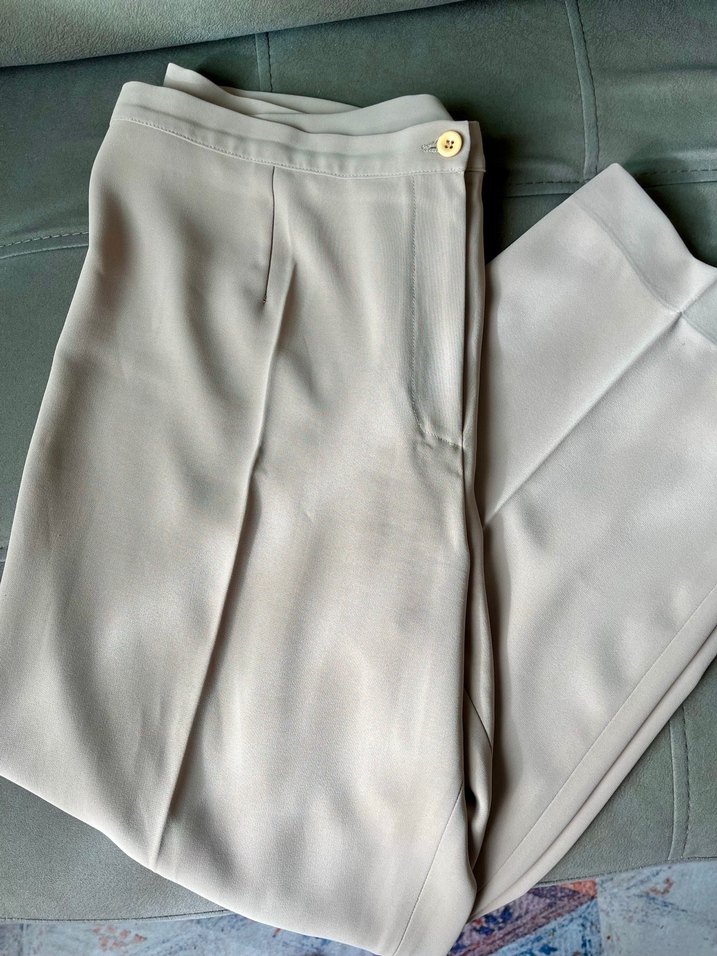 Düğmeli ve düz bej midi uzunlukta, normal kesim kadın kumaş pantolon, ofis için uygundur.