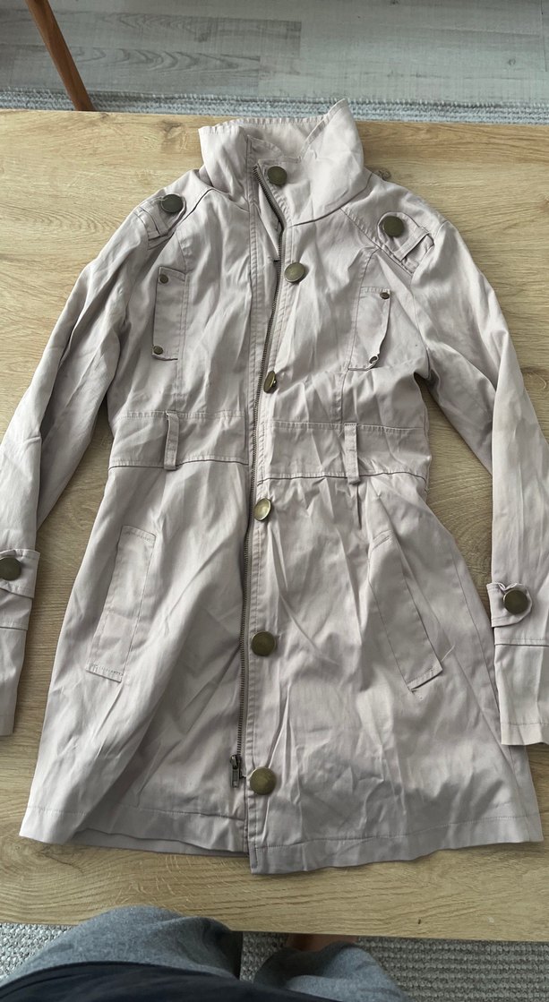 Bej renkli, düğmeli ve kesimli midi trençkot. Keten kumaştan, uzun kollu ve sade tasarımlıdır. Günlük rahat sokak tarzı için uygundur. İç astarı sökülmüş dikilebilir