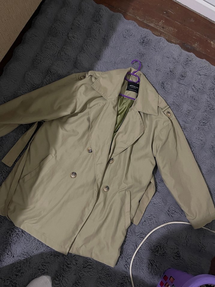 Bej renkli, düğmeli midi trençkot, notched yaka ve uzun kolludur. Sentetik kumaştan üretilmiş, rahat ve günlük kullanıma uygundur.