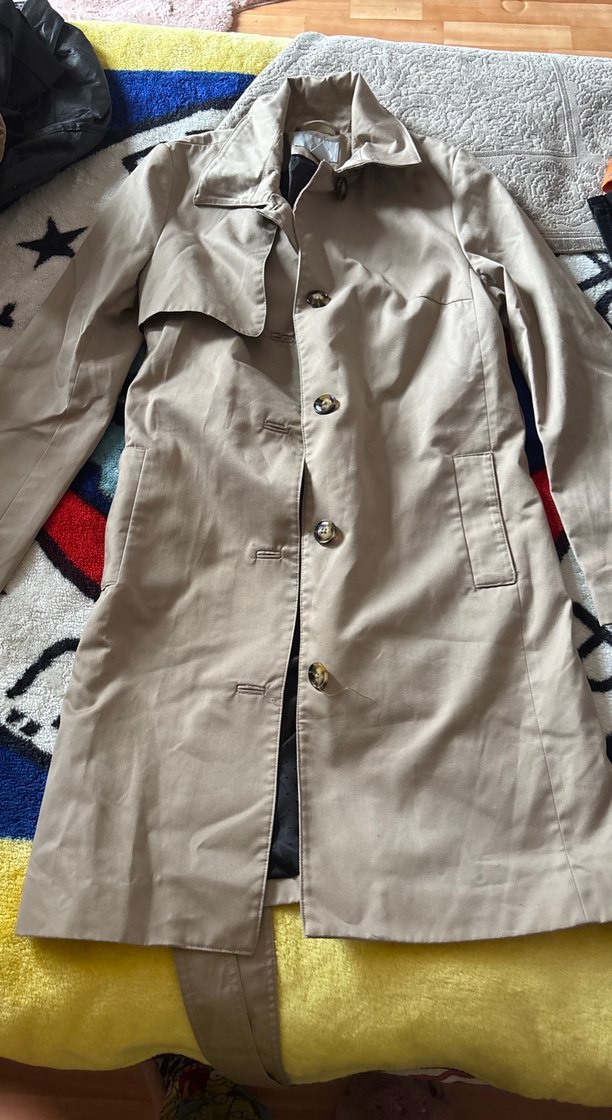 Düğmeli ve notched yakalı, bej renkli midi boy kadın trençkot. Sentetik kumaştan, uzun kollu ve günlük kullanıma uygun, şık ve sade tasarım.