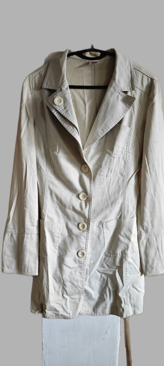 Düğmeli, bej midi trençkot. Hafif keten kumaştan, uzun kollu ve regular fit kesim. Günlük sokak stili için uygun.