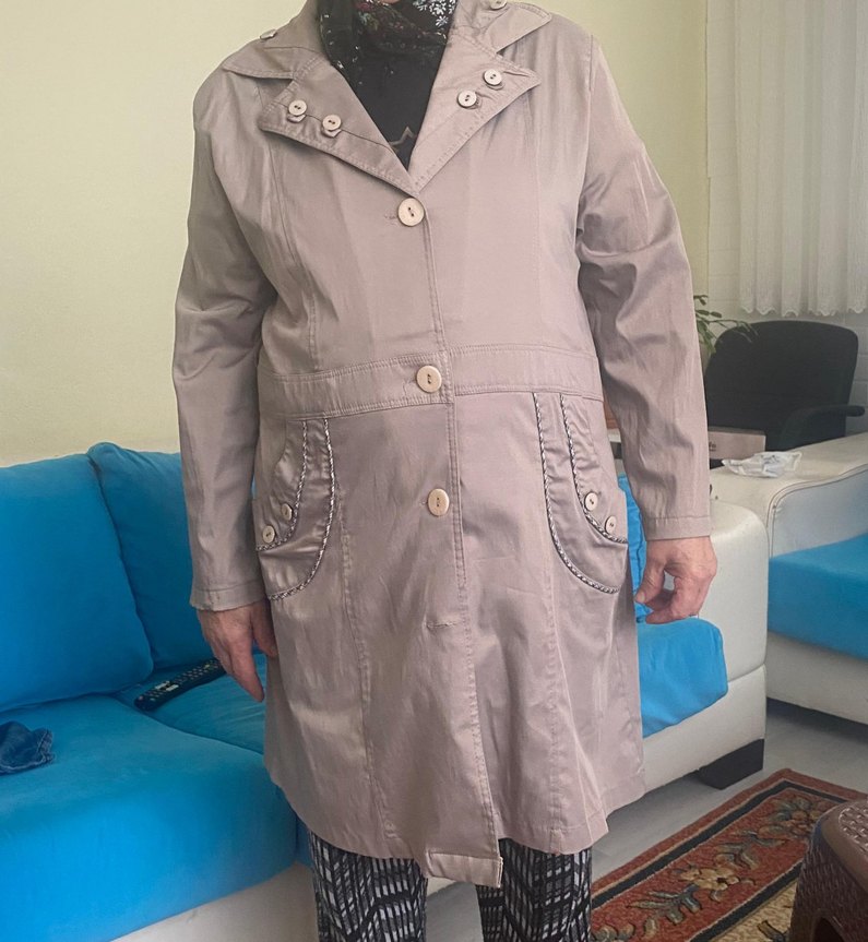 Bej renkli midi uzunlukta, düğmeli, yaka ve cep detaylı kadın trençkot.