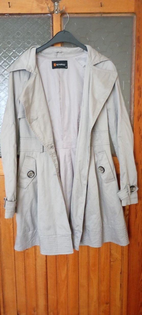 Bej renkli, uzun kollu, düğmeli kadın trençkot. Midi boy, bol kesim ve keten kumaştan, günlük ve sokak tarzına uygun.