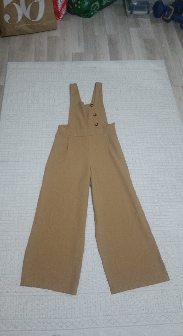 Bej renkli midi uzunlukta, düğmeli ve yakalı, kolsuz, rahat kesim kadın tulumu. Yumuşak sentetik kumaştan, gündelik kullanım için uygun.