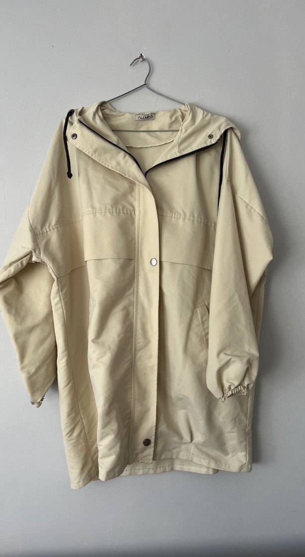 Bej renkli kadın yağmurluğu, düğmeli, uzun kollu ve notlu yaka tasarıma sahiptir. Sentetik kumaştan yapılmış, midi boy ve bol kesimdir. Minimalist tarzda sade ve desensizdir. ☔ ufak tefek lekeler var
