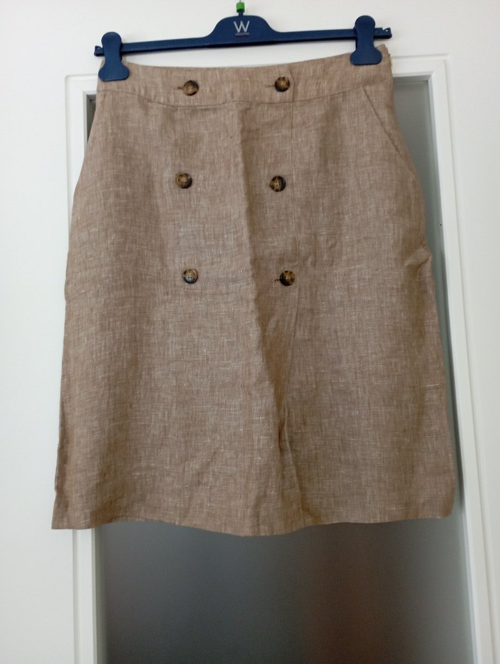 Bej renkli, düğmeli önde detaylı, keten kumaştan midi boy Rahat kesimli ve ofis kullanımı için uygundur.