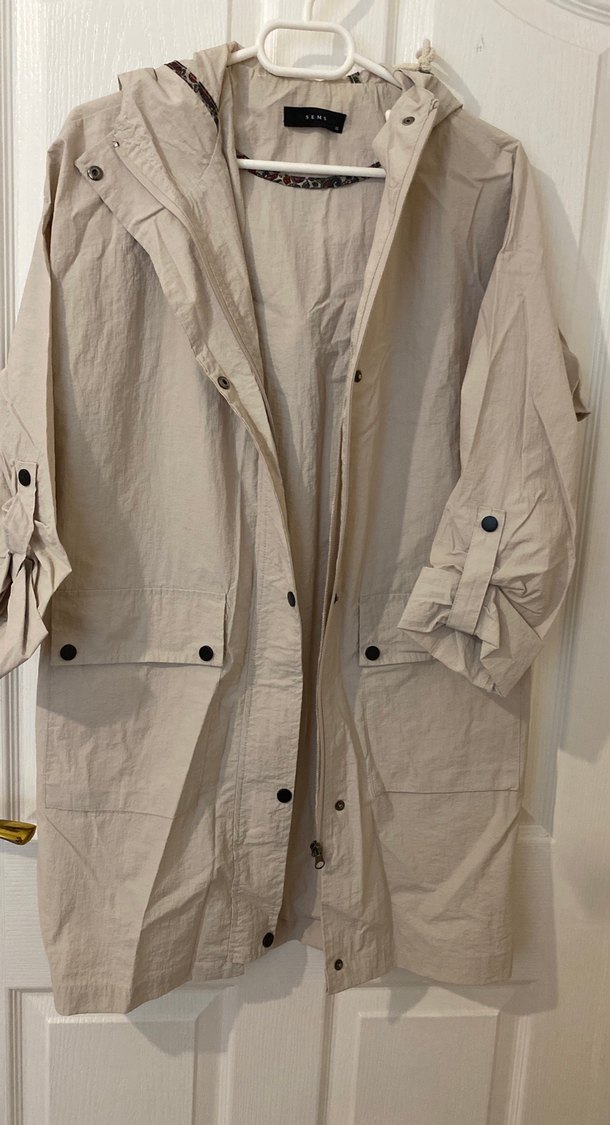 Bej midi keten kadın yağmurluğu, düğmeli ve bol kesimdir. Notlu yaka ve uzun kolludur, günlük rahat sokak tarzına uygundur. ☔️