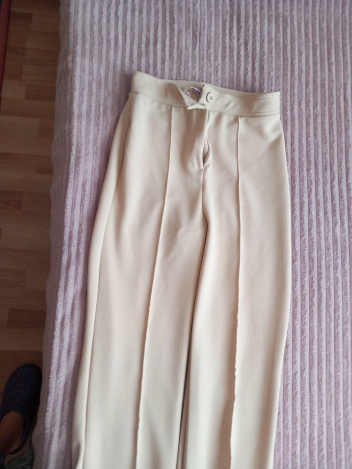 Düğmeli, bej renkli, midi boy kadın kumaş pantolon. Rahat sentetik kumaştan, normal kesim ve gündelik kullanıma uygun.