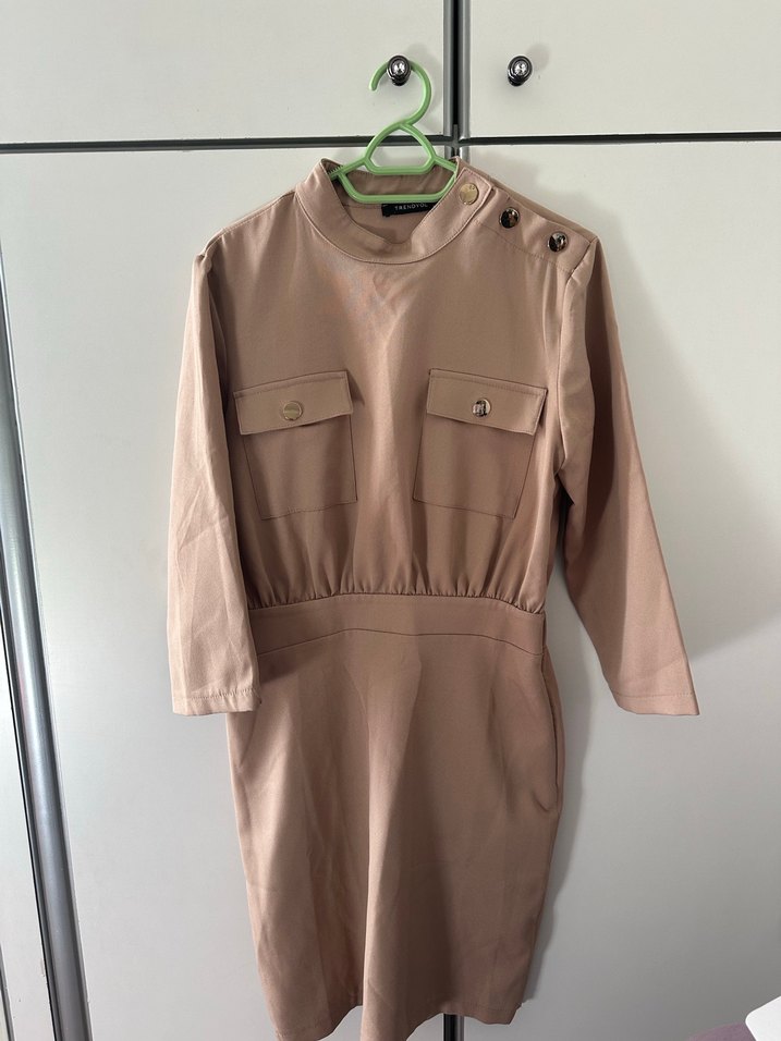 Düğmeli omuz detaylı, uzun kollu ve yüksek yakalı, bej renkte, düz ve vücuda oturan midi elbise. Günlük kullanıma uygun, minimalist tarzda. #elbise