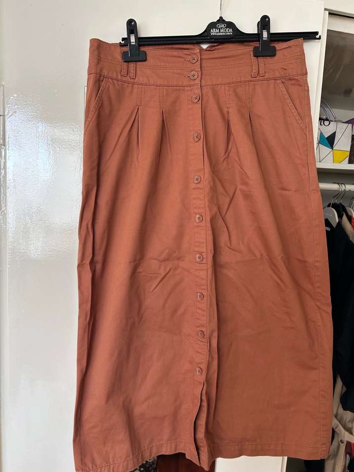 Bej renkte, düğmeli ve bol kesim midi pamuk etek. Günlük kullanıma uygun rahat ve sade bir tasarıma sahiptir.