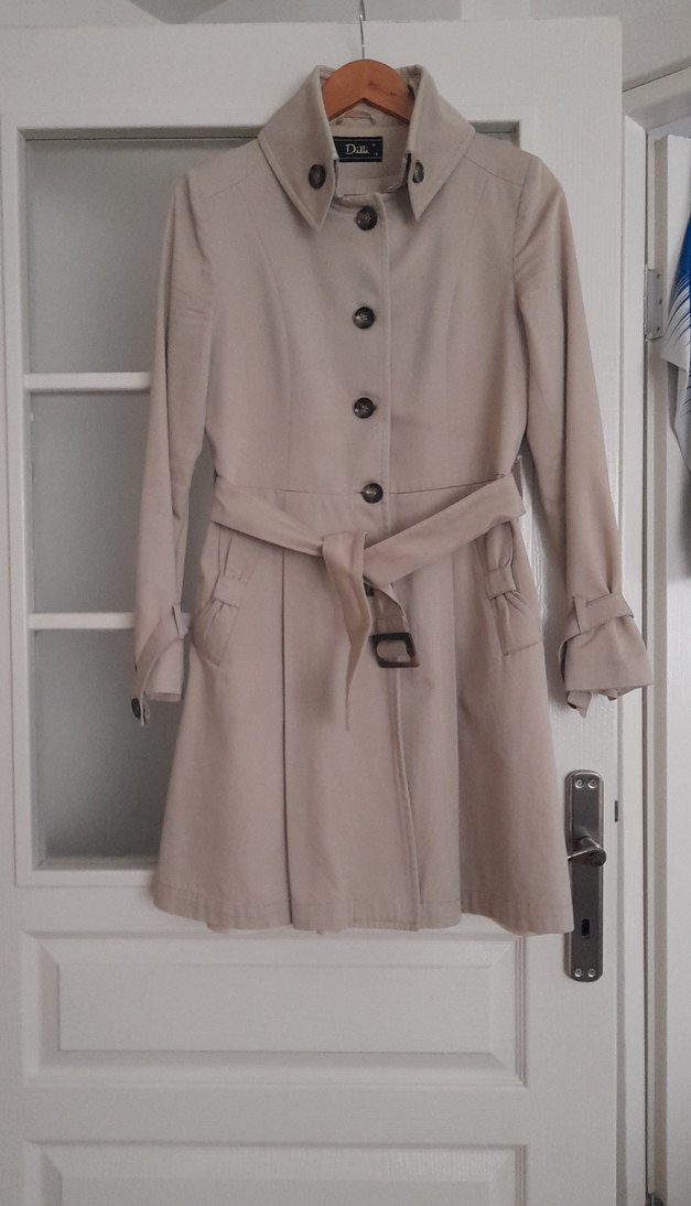 Düğmeli ön ve kemerli bel detayına sahip bej midi trençkot. Notlu yaka ve askılı kolları ile yumuşak sentetik kumaştan üretilmiştir. Sade tasarımıyla trend sokak stiline uygundur. İç astarlidir.sadece arka kısmında çok minik kumaş hatası var belli bile olmuyor.Marka temsili