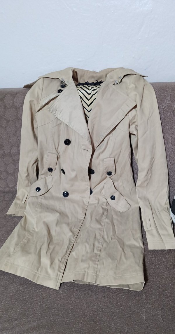 Bej renkli midi uzunlukta, düğmeli trençkot. Notlu yaka ve uzun kollu, sentetik kumaştan, günlük sokak stiline uygun rahat kesim.