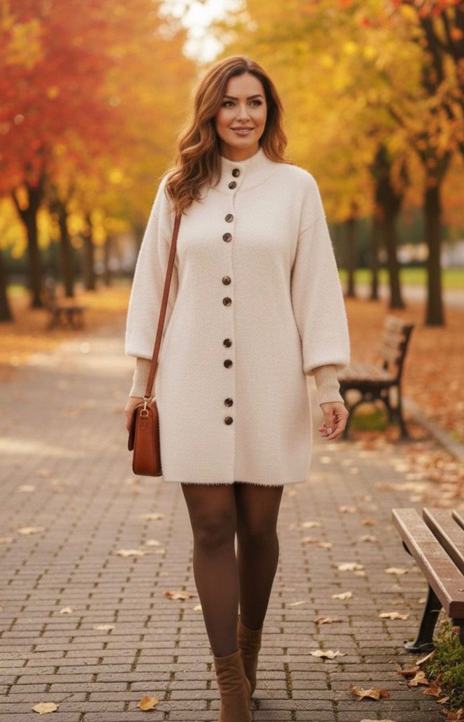 Bej renkli, düğmeli midi triko elbise, uzun kollu ve yuvarlak yakalıdır. Rahat kesimi ve yumuşak, sıcak kumaşıyla günlük kullanıma uygundur.S M L beden uygundur
