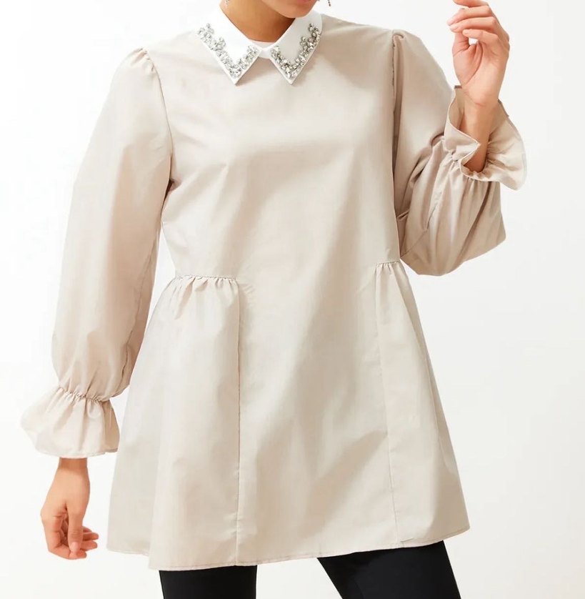 Düğmeli yakalı, bej renk midi boy tunik. Uzun kollu, pileli manşetli ve bol kesimdir. Pürüzsüz sentetik kumaştan, ofis için uygun.