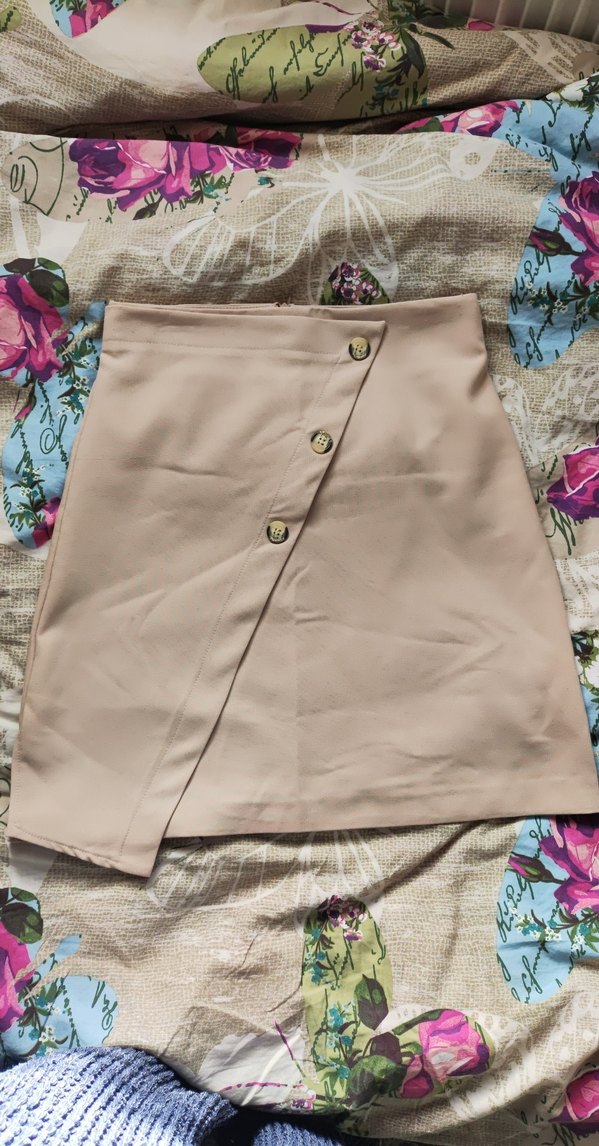 Düğmeli ön kısmı ve regular kesimi olan bej mini etek, yumuşak sentetik kumaştan üretilmiştir. Pastel ve sade tasarımı günlük sokak stiline uygundur.