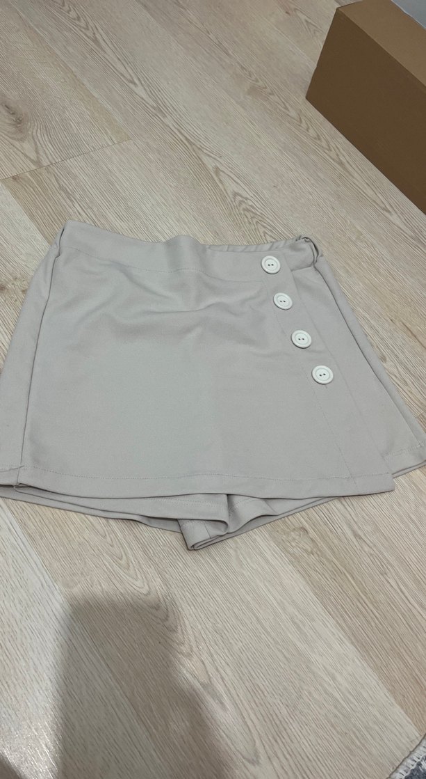Bej renkte, düğmeli detaylı ve bol kesim mini etek. Düz ve sentetik kumaştan, günlük sokak giyimine uygun.