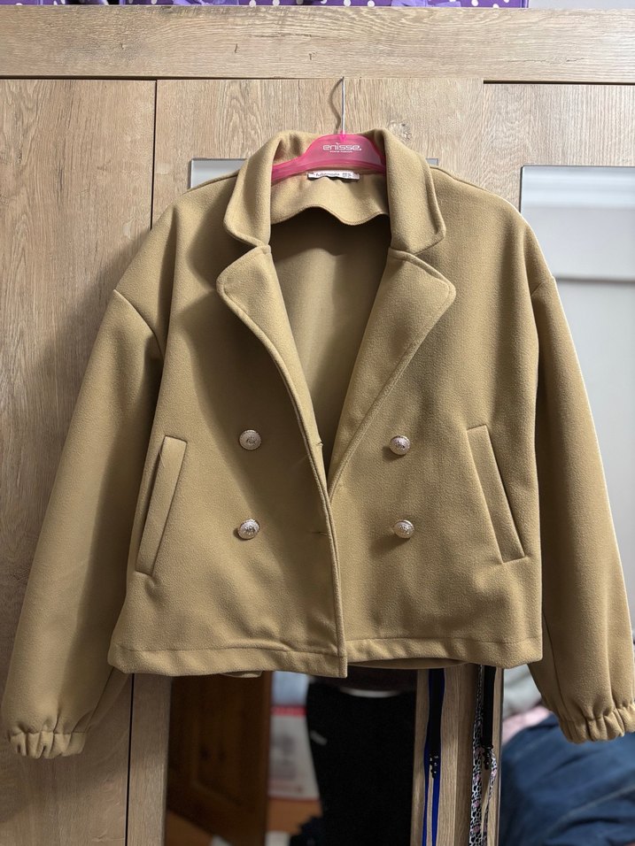 Düğmeli, bej renkli, kısa kesim kadın ceket. Notch yaka ve uzun kollu, rahat kesimli, yumuşak ve sıcak kumaştan üretilmiştir. Şehir stili için uygun. Herhangi bir defosu yok, beden olarak M diyor ama M bedene biraz dar gelebilir .