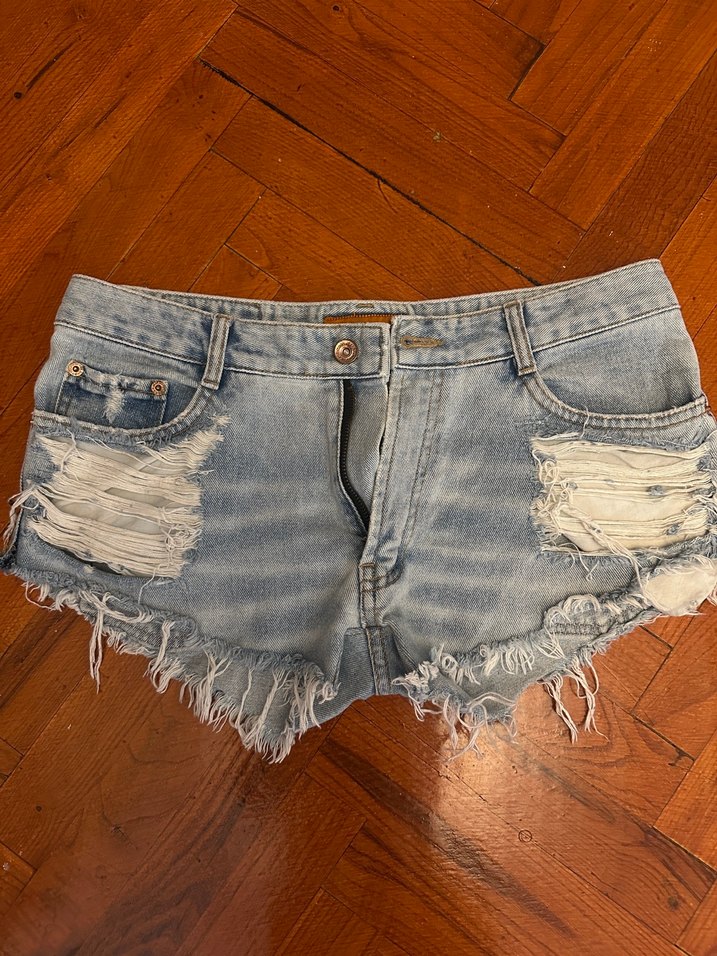 Düğmeli, bol kesim, açık bej renk mini jean şort. Yırtık detaylarıyla gündelik rahat ve trend bir görünüm sunar. Bel çevresi 39 cm, ağ kısım 25 cm, boy 22 cm. #sıfır #yeni #düşükbel