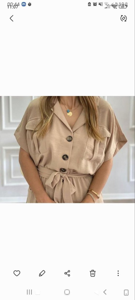 Bej renkli, düğmeli kısa keten tulum. Yaka detaylı, kısa kollu ve bol kesimdir. Belde bağcık ile şekillendirilebilir. Minimalist tarzda, günlük kullanım için uygundur.