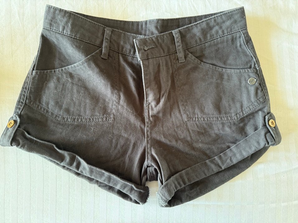 Düğmeli, bol kesim ve bej renkli mini şort. Günlük rahat kullanım için uygundur.