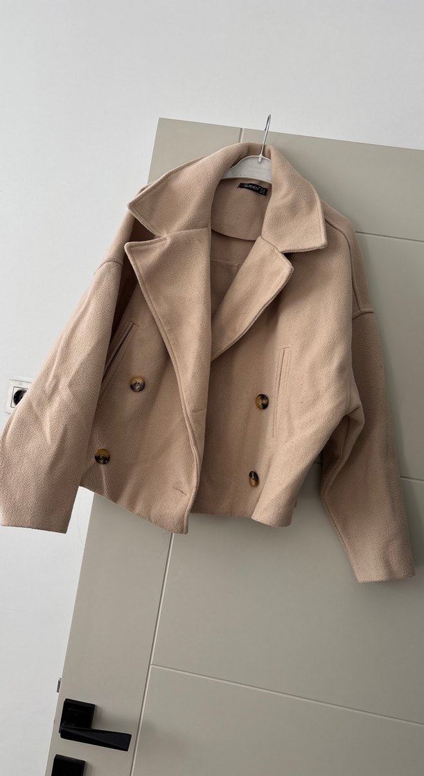 Bej renkli, düğmeli ve kesik yaka tasarımlı kısa süet kaban. Strappy kollu, rahat kesimiyle günlük şık sokak modasına uygundur.