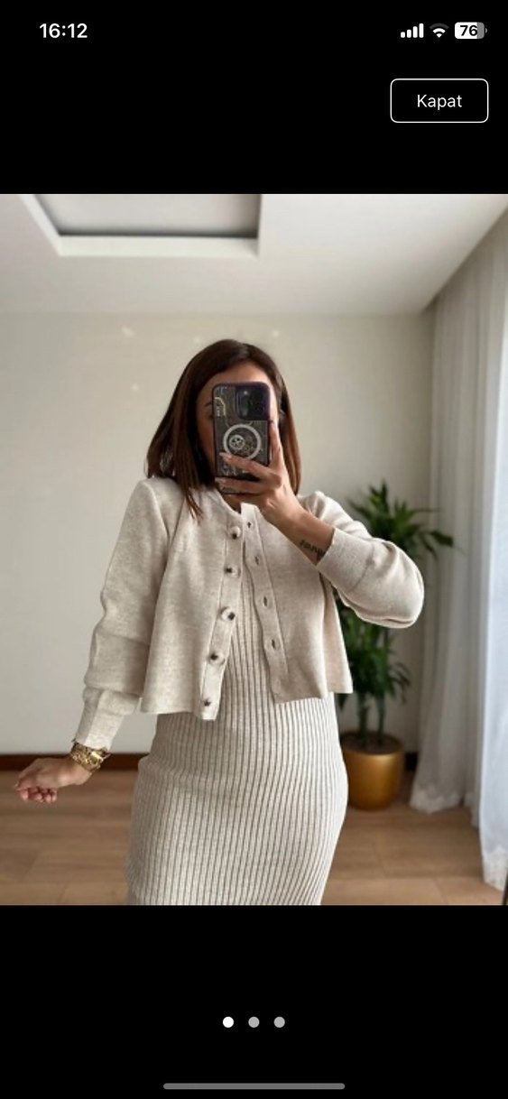 Uzun kollu, düğmeli ön detaylı bej mini triko elbise. Vücuda oturan kesimi ve yuvarlak yaka ile gündelik kullanım için uygundur. (Hiç giyilmedi)standart beden