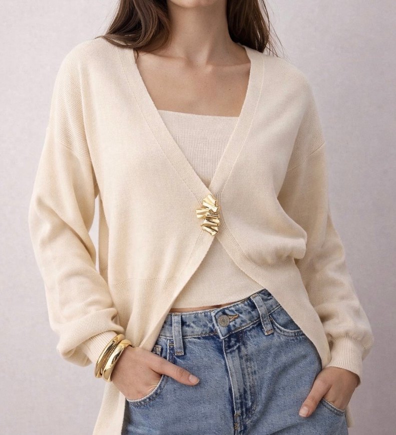 Bej renkli, düğmeli, V yaka, uzun kollu, kısa kesim kadın hırkası. Rahat ve salaş kesimiyle günlük sokak stili için uygundur. İKİLİ TAKIM