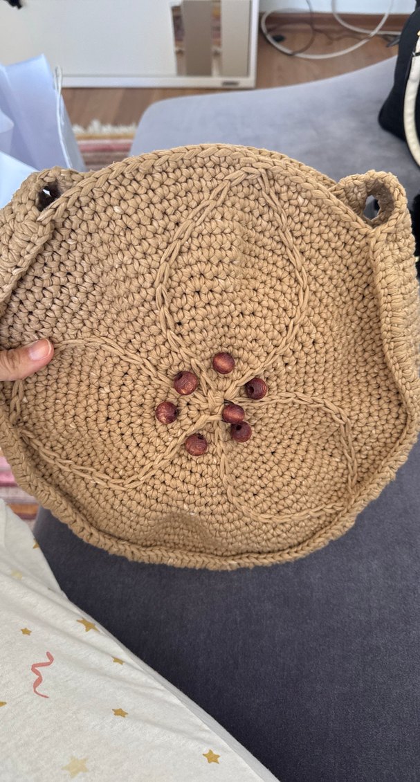 Bej renkli, düğmeli örgü kadın çantası. Bohem tarzda, rahat ve desen içermeyen tasarımıyla günlük kullanıma uygun. Ahşap düğme detaylı.