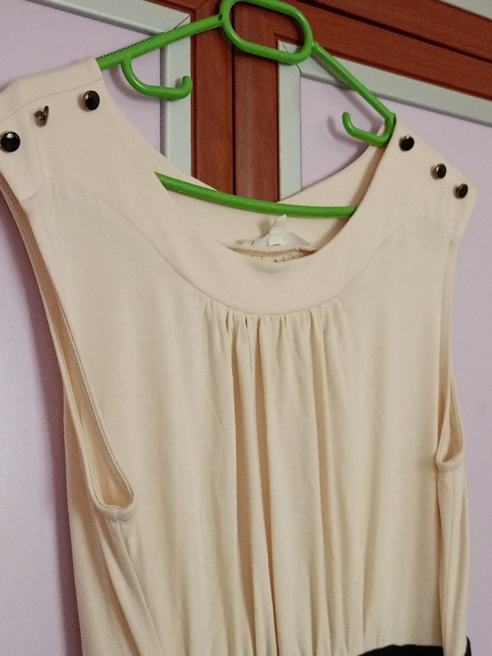 Düğmeli, bej renkli pamuklu çok rahat elbisesi yuvarlak yakalı ve kolsuzdur. Rahat ve bol kesimi günlük kullanıma uygundur. Midi boyda, desensiz ve minimalist tarzda bir elbisedir.
