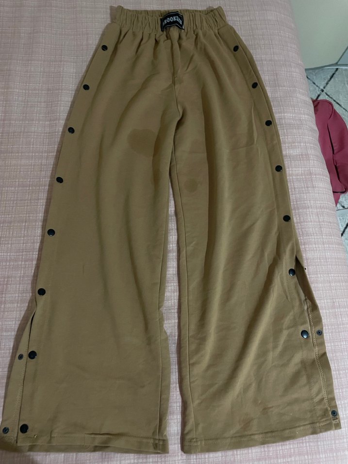 Düğmeli, yanları düğmeli bej renkli salaş eşofman, günlük rahat kullanım için uygundur. Üzerinde görselde görülen leke var ona göre alın
