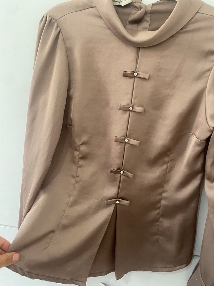 Düğmeli, bej renkte, saten kumaştan, uzun kollu ve kısa kesim modern klasik bluz. Ofis için uygun, şık ve zarif görünüme sahiptir.