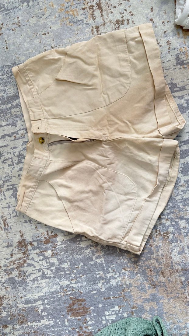 Yumuşak pamuktan yapılmış, düğmeli, bol kesim bej şort. Günlük rahat kullanıma uygun sade tasarım.