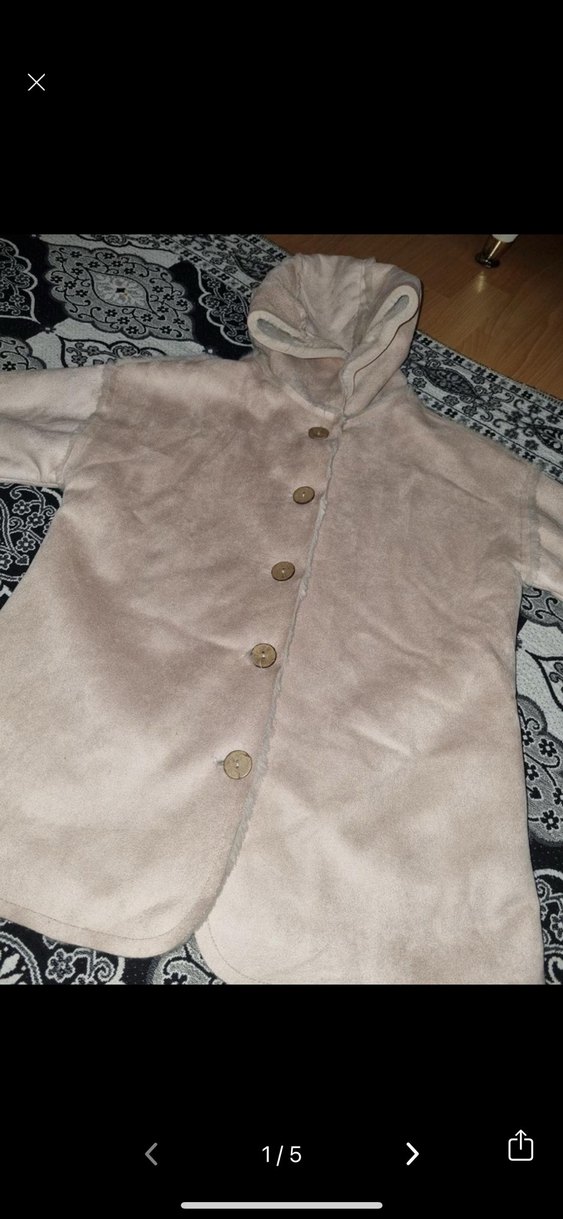 Bej süet çocuk mont. düğmeli ve yakalıdır. Rahat kesim, uzun kollu ve kapüşonludur. Midi boyda, desen içermeyen günlük sokak stiline uygundur.