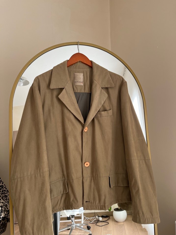 Düğmeli bej süet erkek ceket, normal kesim ve uzun kolludur. Midi boyda, desen içermeyen bu parça ofis kullanımı için uygundur.