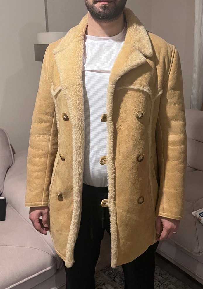 Düğmeli ve bej renkte, yumuşak süet kumaştan yapılmış erkek kaban. Normal boy, uzun kollu ve içi sıcak tutan yün günlük kullanıma uygun.